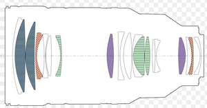 16 éléments (dont 1 en verre ED et 5 à haut indice de réfraction) en 14 groupes, m.a.p. mini 0,60 m. Champ 63-30°.